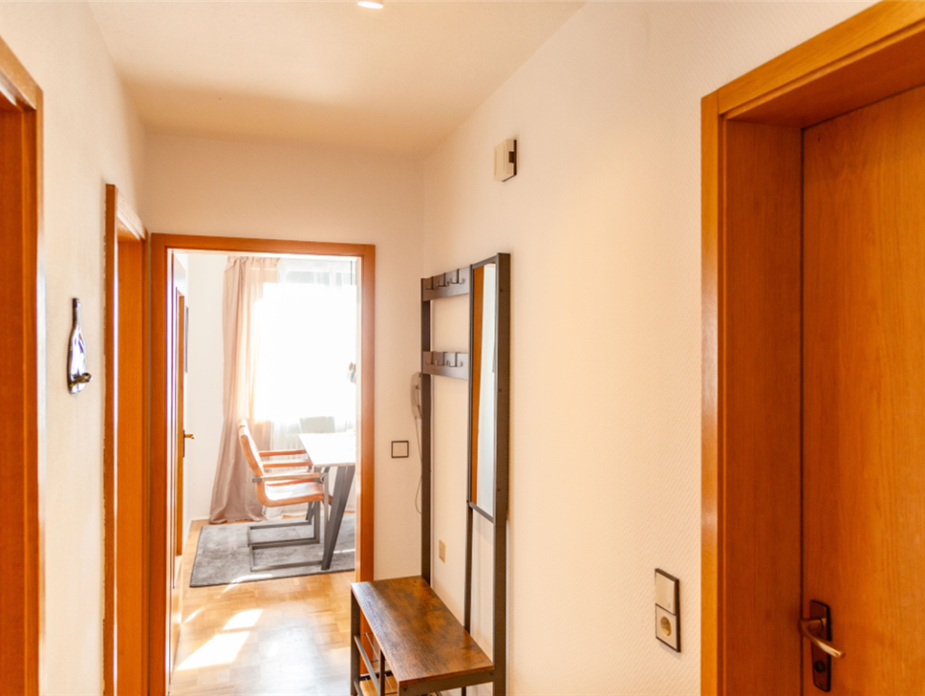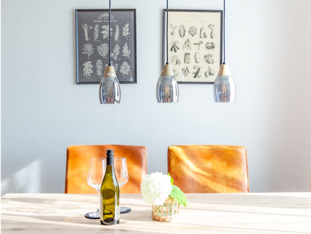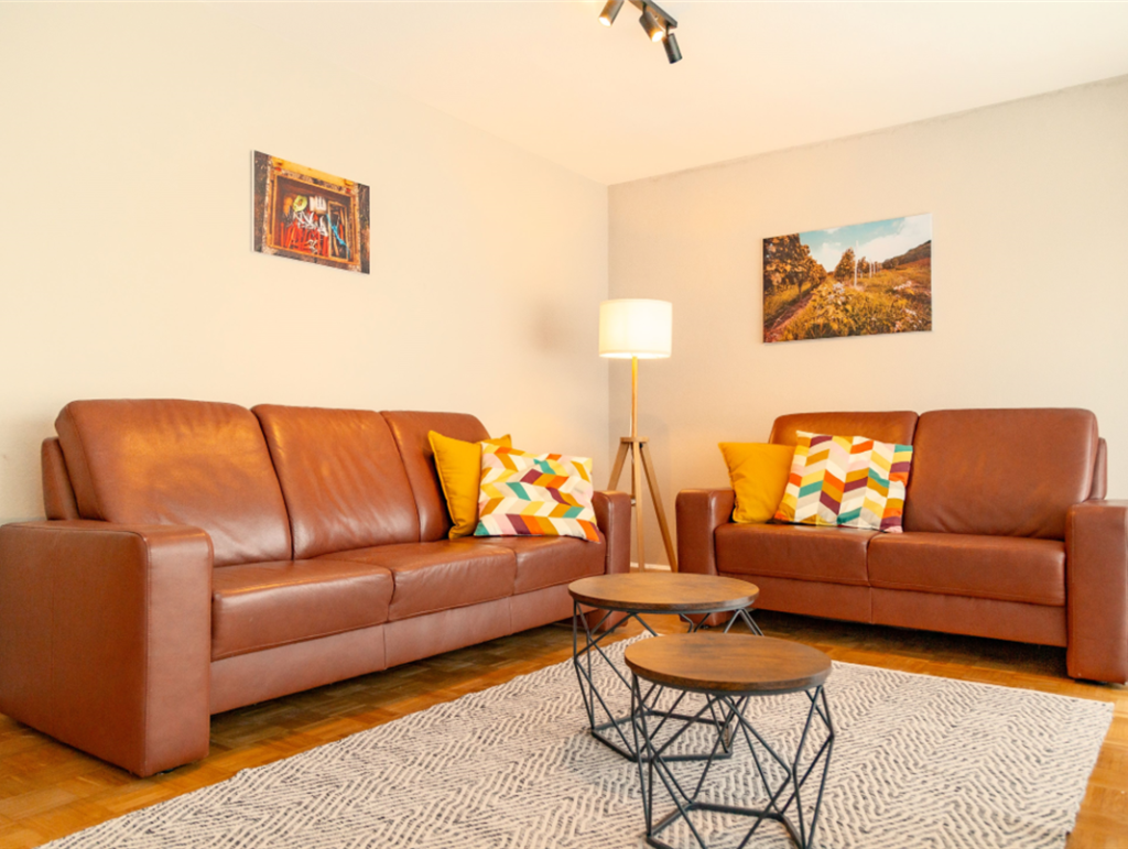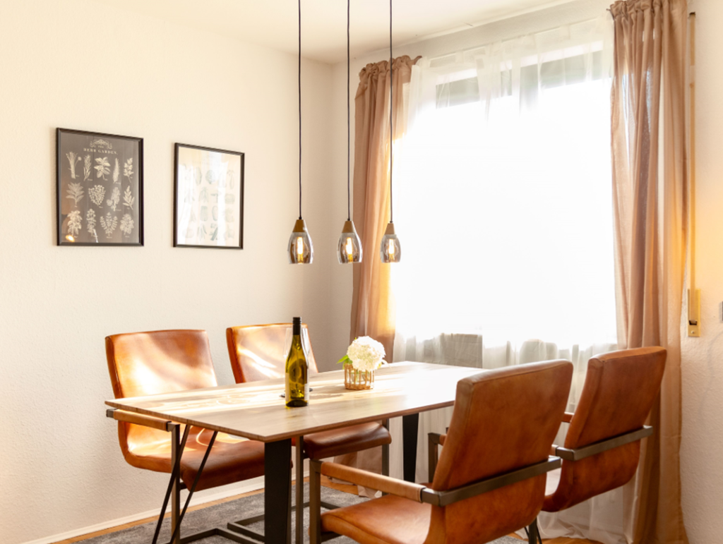 • Lichtdurchflutetes Wohnzimmer mit bodentiefen Fenstern, TV, ggf. mit Schlafsofa (alternativ: Ledersofa). Für euer „workation“ stellen wir auf Wunsch einen Arbeitstisch ins Wohnzimmer