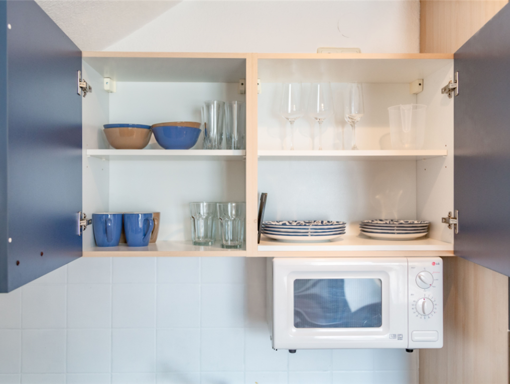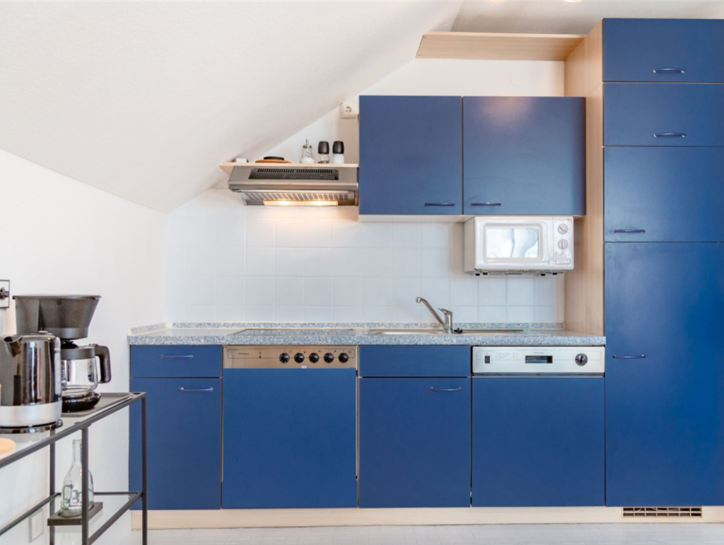 • Die Küchengeräte: Mikrowelle, Herd, kleiner Ofen, Spülmaschine, Kühlschrank mit Tiefkühlung, Toaster, Wasserkocher, Kaffeemaschine
